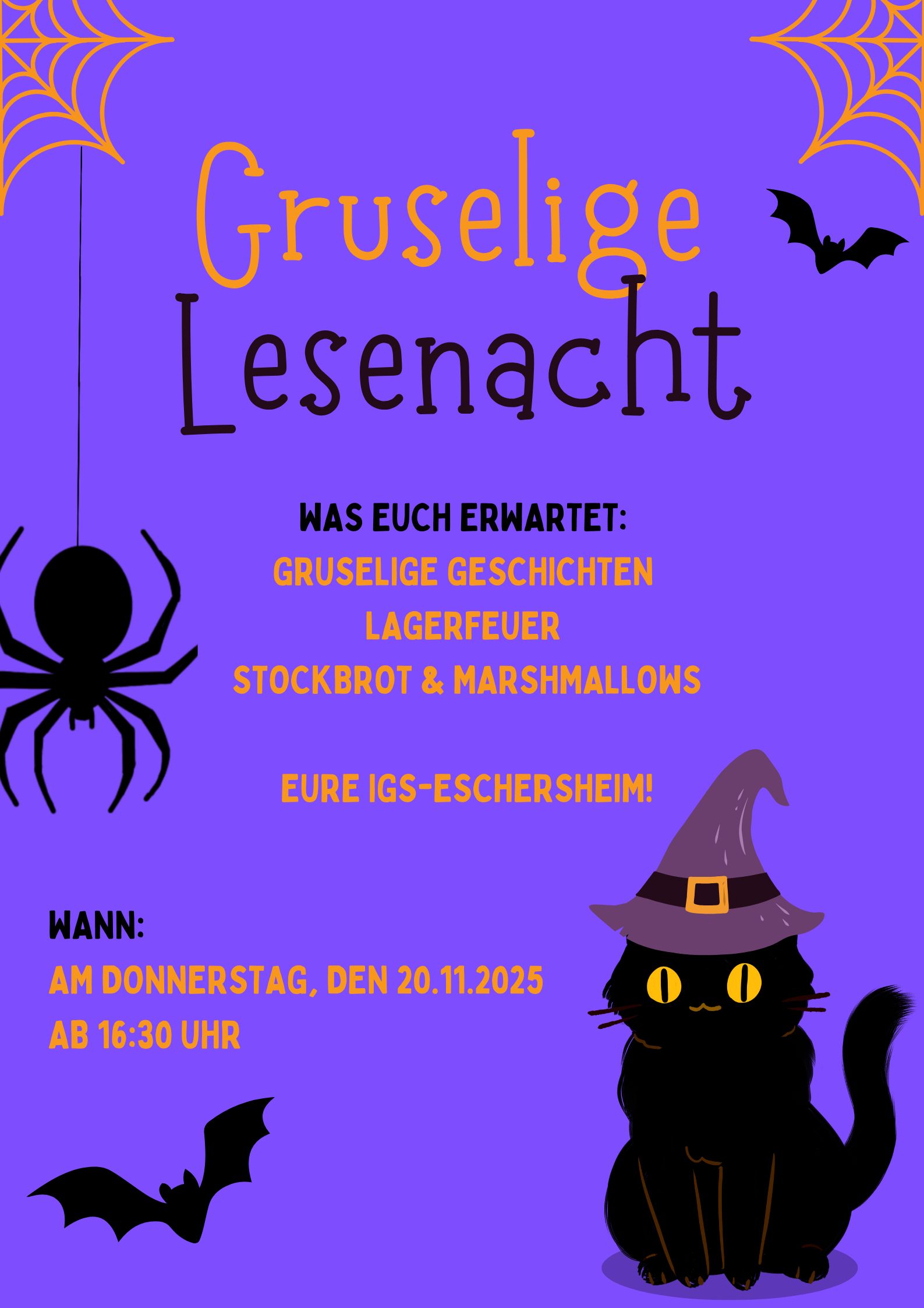am Donnerstag, den 20. November 2025 findet zum zweiten Mal unsere gruselige Lesenacht statt, in der wir euch das Fürchten lehren! In mehreren Räumen werden für unterschiedliche Altersklassen Gruselgeschichten vorgelesen und für die Kleinen gibt es ein Bilderbuchkino.